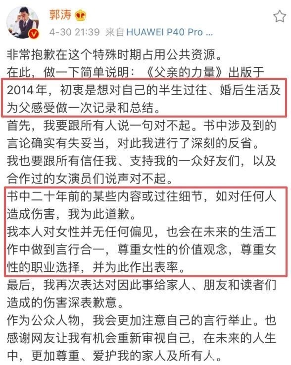 然而生活并非总是一帆风顺。2014年郭涛出版书籍《父亲的力量》,书中提及过往感情经历时,部分言论被指涉嫌贬低女性,尤其“曾掌掴前任”一事引发轩然大波。