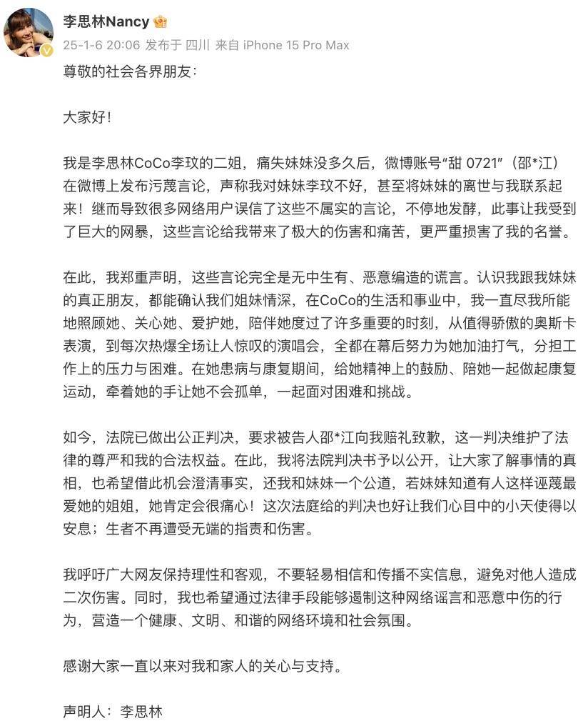 2025年1月6日,李玟的姐姐李思林在个人社交账号晒出名誉维权案件简讯,称网传“她对李玟不好”,“将妹妹的离世与她联系起来”等言论属无中生有、恶意编造。